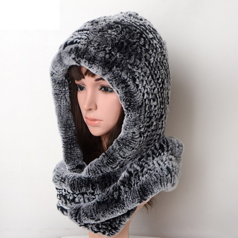 Women's Real Rex Rabbit Fur Hooded Hat Scarf