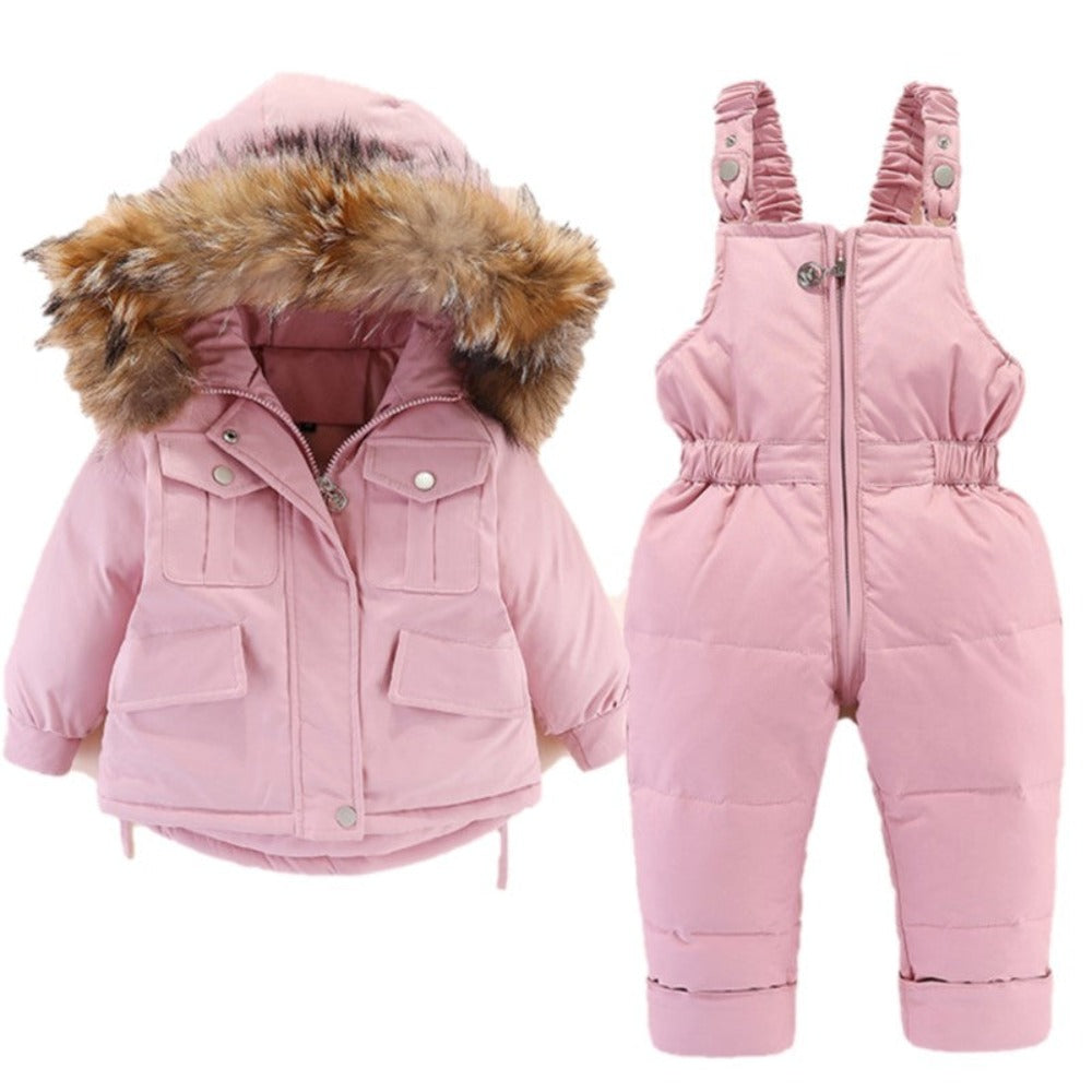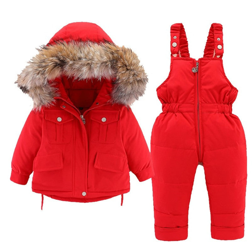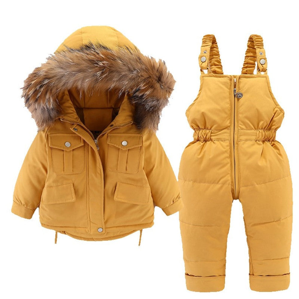 Our 2pcs jacket and jumpsuit for children have lightweight nylon waterproof shell fabric, three-snap closures, special outgrown cuffs that extend to accommodate for growth over multiple seasons and an attached faux fur hood storm hood. Very suitable comfortable & durable baby suit for winter outwear.