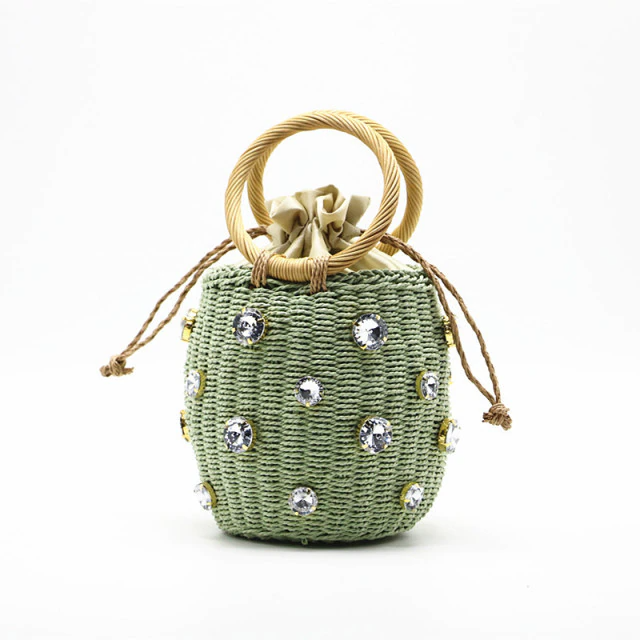 Handmade rhinestone crystal embellished small straw bucket bags