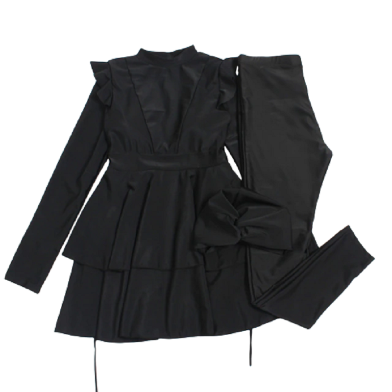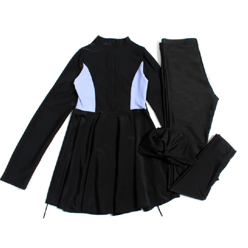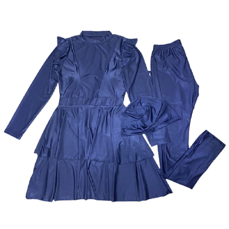 This is made from high-quality polyester and it has great durability. The material is light in weight, soft to touch and quick drying. This set consists of three-piece- long sleeve top, pants and a hijab.