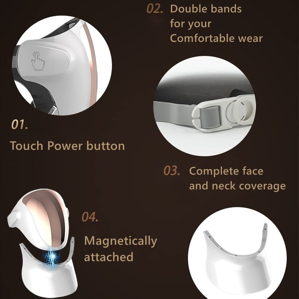 A face and neck mask is an FDA-approved technique for wrinkle reduction, acne treatment, and other skin advantages. You may line up or remove the neck mask at any time—use the face mask alone or face+neck together! To turn the mask on and off, simply press the touchpad on the upper right side. There are no adverse effects, and it provides pure light and energy for skin care that is ideal for all skin types and is quite simple to use.