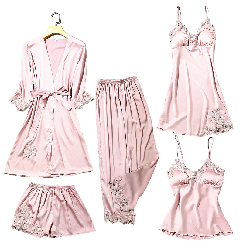 It is made from a superior quality satin material that is super easy to take care of. It comes with five pieces of sleepwear that include a camisole, trousers, shorts, a sleeper dress and a row. It has a wonderful lace design that makes this set special and beautiful.