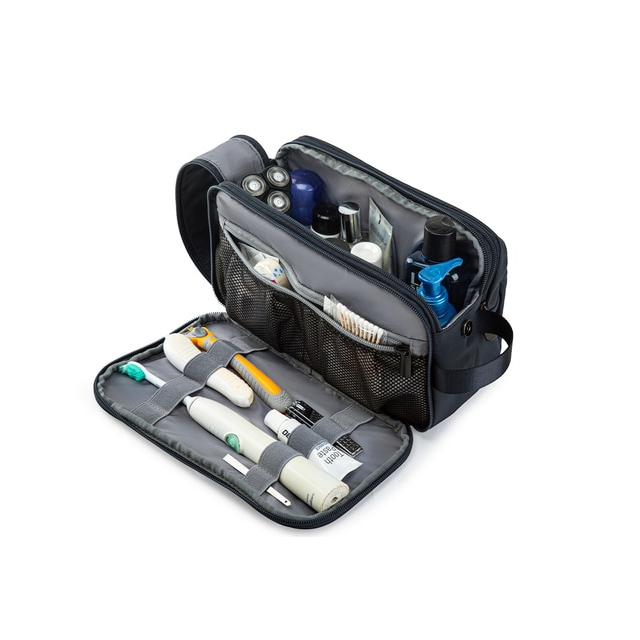 The compartment is visible, and the inside PVC pocket, which is easy to clean, may separate wet and dry goods. The main compartment is large and has elastic straps to keep bottles upright. Inside, many compartments to keep all of your toiletries and shaving equipment organized.
