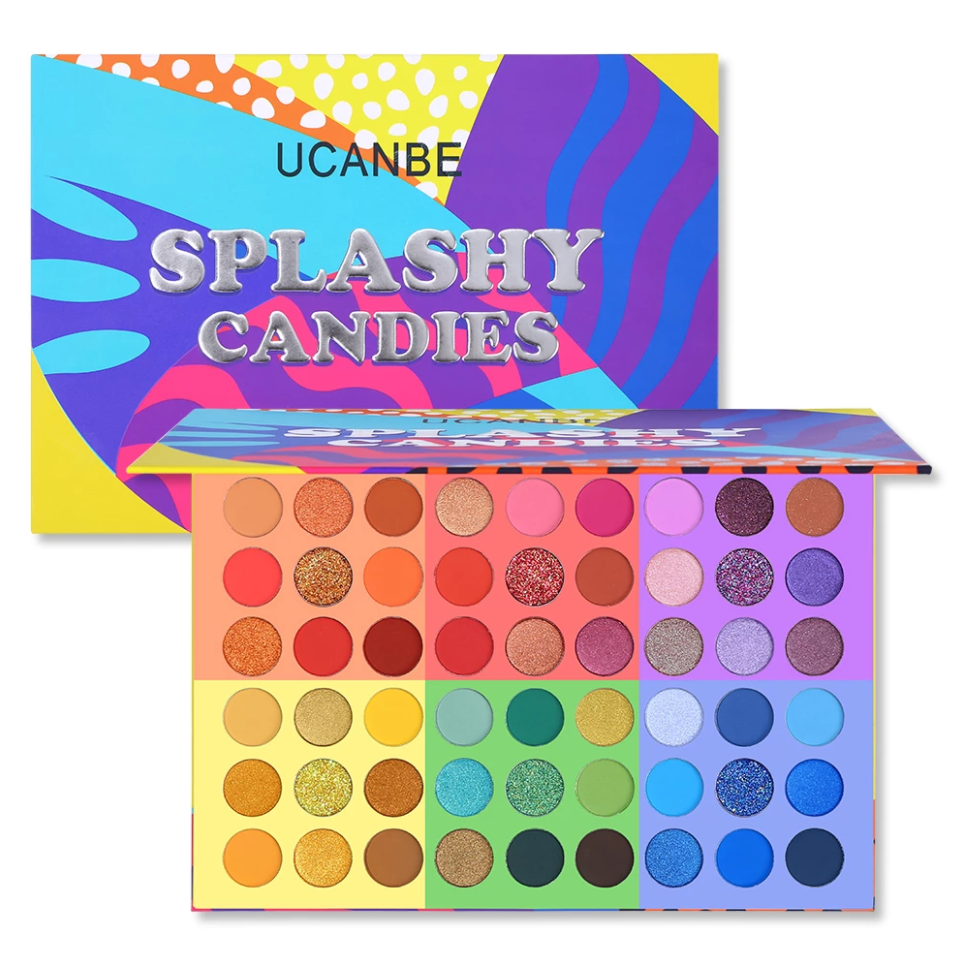 - The 54-color eyeshadow palette consists of 6 areas: orange, red, purple, yellow, green, and blue.