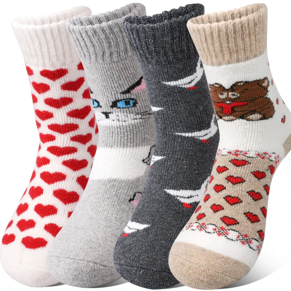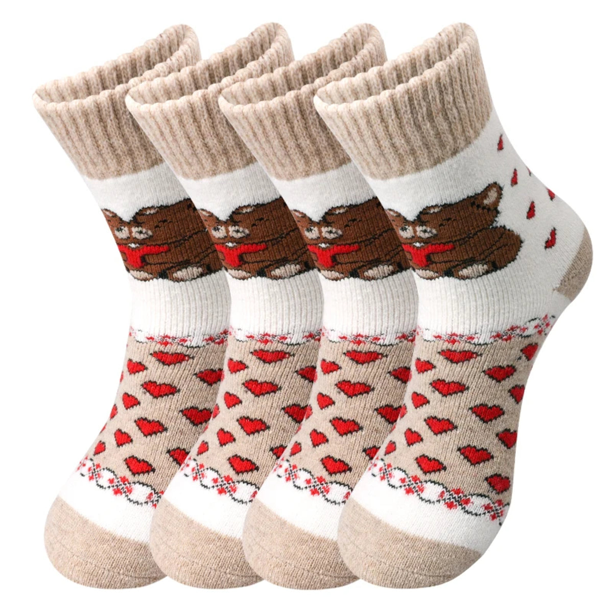 Women’s 4 Pairs Crew Socks – Bear and Heart Print Plush Knit Winter Comfort